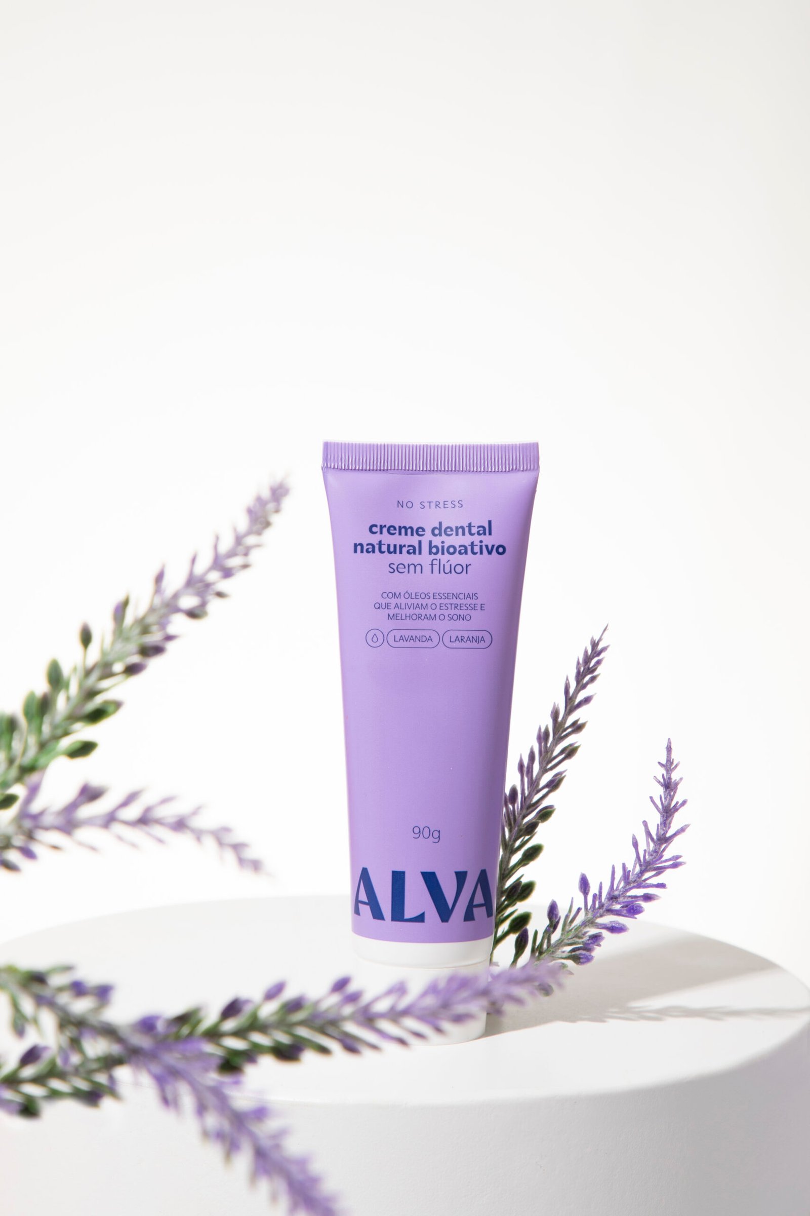 Pasta de Dente NO STRESS: a fusão dos óleos essenciais de lavanda e laranja doce traz relaxamento, bom humor, alívio do estresse diário e melhora do sono.